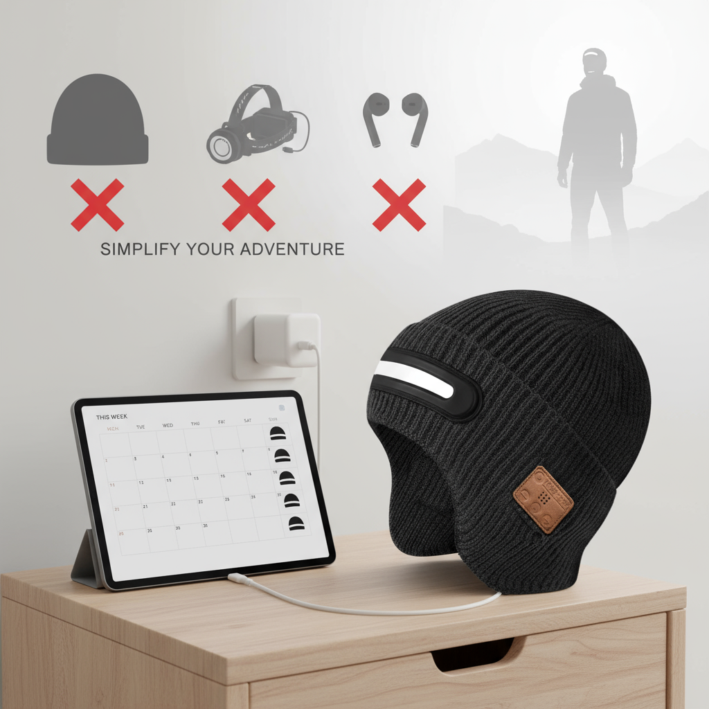 Stop managing three separate batteries and three separate devices. The Winter Bluetooth Beacon Beanie consolidates your beanie, headlamp, and wireless audio into one integrated solution you charge once per week. Your research identifies decision fatigue and battery anxiety as the #2 friction point for customers currently buying separate gear—they're tracking which device died, rewrapping cables, and spending mental energy on gear management instead of on their workout or commute. The Beacon eliminates this. One beanie on Sunday night, one charge, and you're ready for the entire week of dark-weather outings. This simplicity compounds: fewer decisions, fewer failure points, fewer moments of frustration before you even start moving.​