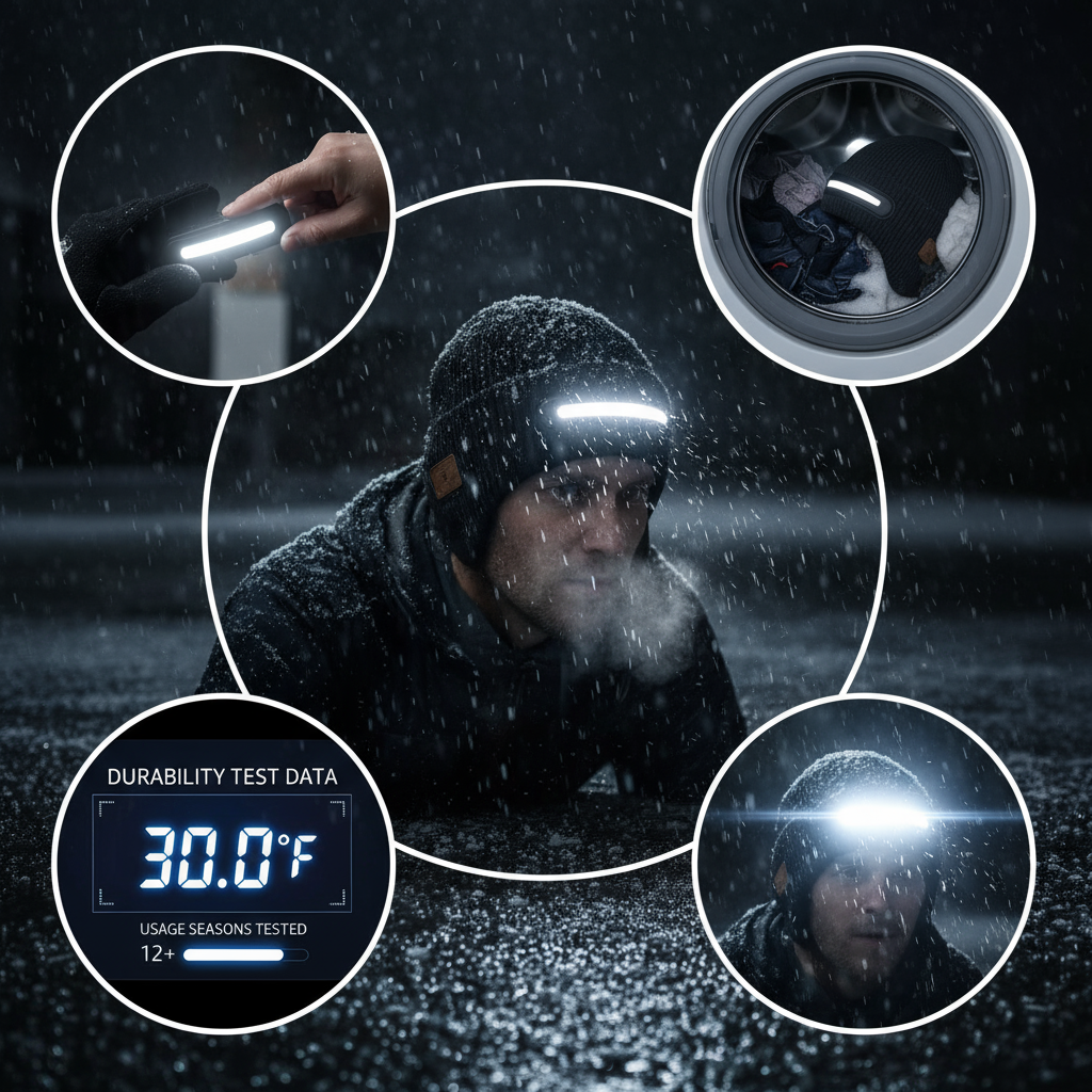 This beanie works in actual 30°F darkness, rain, and wind—not just in lab conditions or marketing photos. Real runners, dog walkers, and commuters have tested it through multiple seasons, and the proof is in the details: Bluetooth reconnects in 2 seconds if a rare drop occurs, the LED stays bright even in cold battery conditions, and the quick-release light module removes in seconds for washing without damaging the electronics. Your research captures the silent objection every customer has about integrated gear: "Won't something fail?" The Winter Bluetooth Beacon Beanie answers that by showing actual usage testimonials with specific conditions (frequency, duration, temperature, proof of wear), a transparent teardown video of the quick-release mechanism, and a 30-day money-back guarantee that puts your confidence where your mouth is. This is gear built for humans in real conditions, not a one-trick feature in a fancy box.​